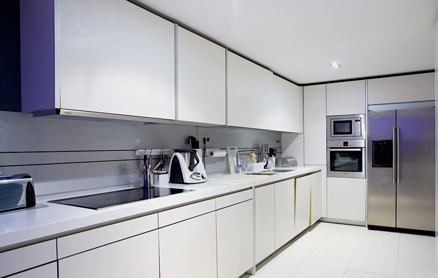 Encimera de hidróxido de aluminio blanco, puertas en tablero de abedul laminado en blanco y panel frontal técnico en aluminio.